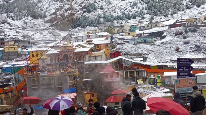 चमोली: बदरीनाथ धाम में हुई बर्फबारी, चारों तरफ बिछी सफेद चादर